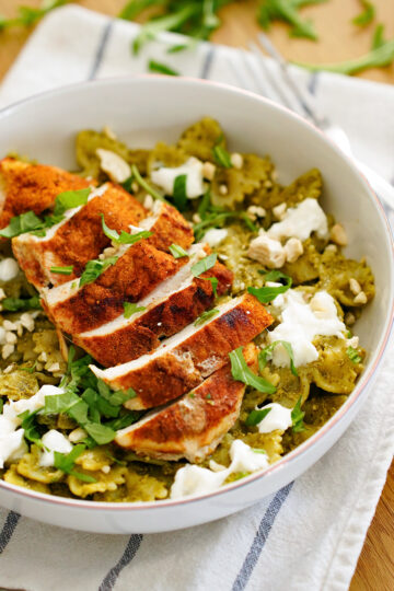 Szybki makaron z pesto, soczystym kurczakiem i burratą. Prosty przepis na pełnowartościowy obiad w 30 minut.
