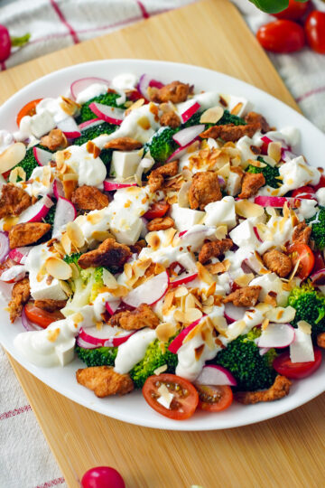 Pyszna sałatka z brokułem i kurczakiem z dodatkiem sera sałatkowego, warzyw i sosu czosnkowego. Szybki, zdrowy i prosty przepis idealny na obiad lub kolację.