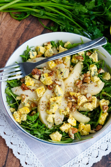 Lekka i aromatyczna sałatka z rukolą, soczystą gruszką, serem z niebieską pleśnią oraz chrupiącymi orzechami włoskimi. Idealna jako zdrowa przekąska, kolacja lub przystawka.