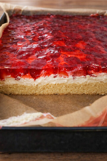Piankowe ciasto z wiśniami i galaretką na biszkoptach