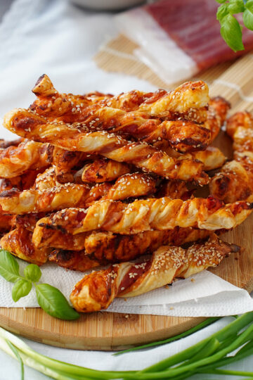 Proste i szybkie paluszki z ciasta francuskiego z mozzarellą i szynką parmeńską. Idealna przekąska na imprezę, gotowe w 20 minut!