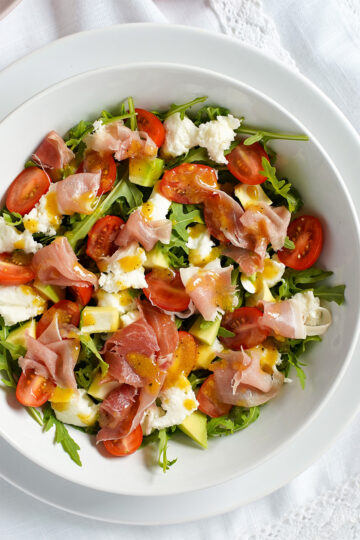 Sałatka z rukolą, burratą, pomidorkami i szynką parmeńską. Lekki, elegancki i zdrowy pomysł na lunch lub kolację.